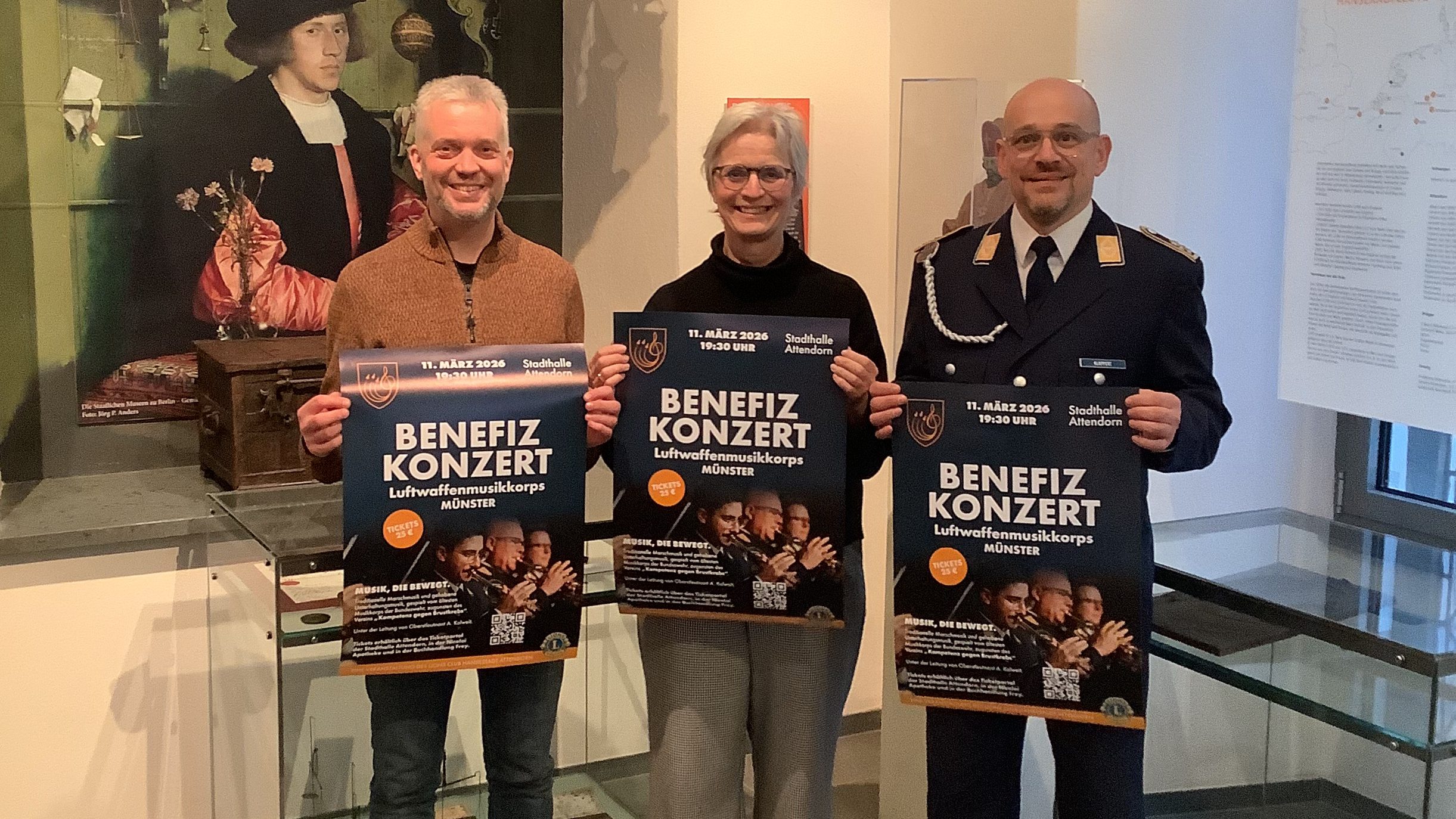 Foto: Freuen sich auf ein hochkarätiges Konzertereignis für den guten Zweck – von rechts nach links: Micha Klappert vom Luftwaffenmusikkorps, Katharina Schulte vom Verein „Kompetenz gegen Brustkrebs“ und Sebastian Springob vom Lionsclub „Hansestadt Attendorn“